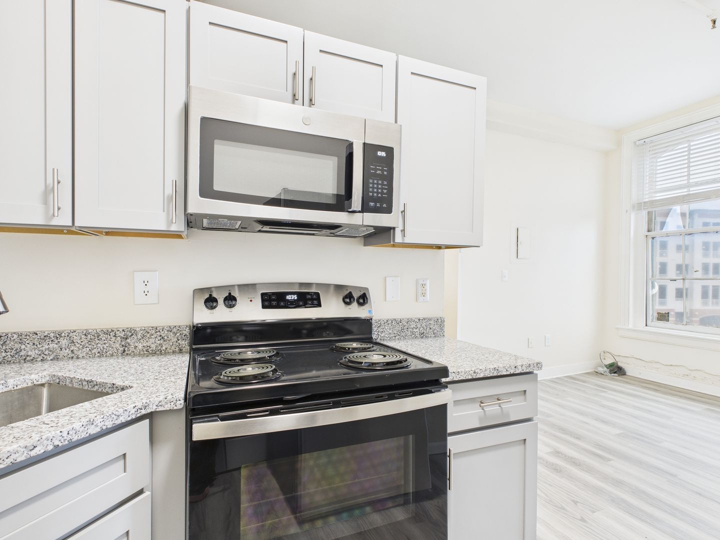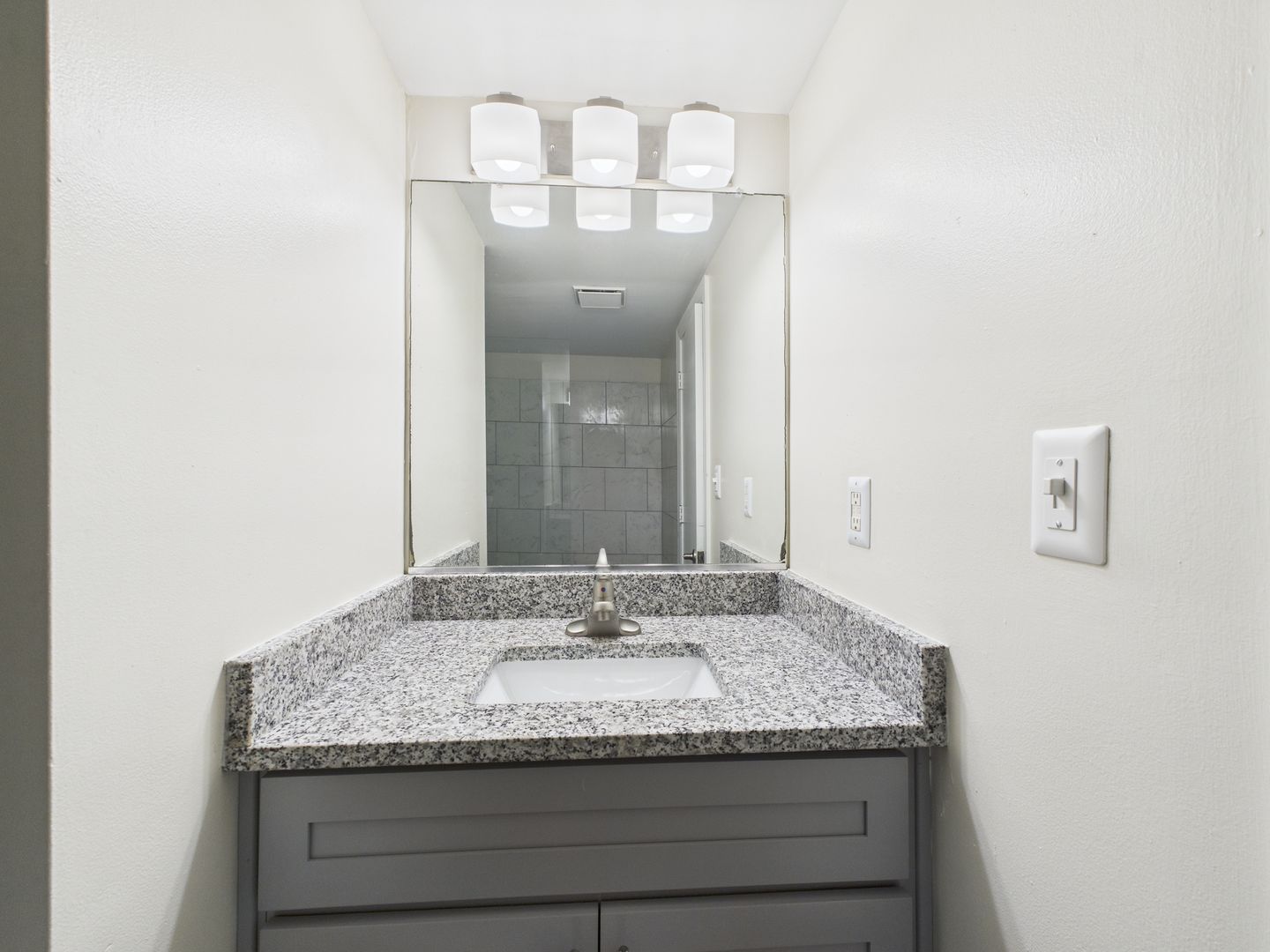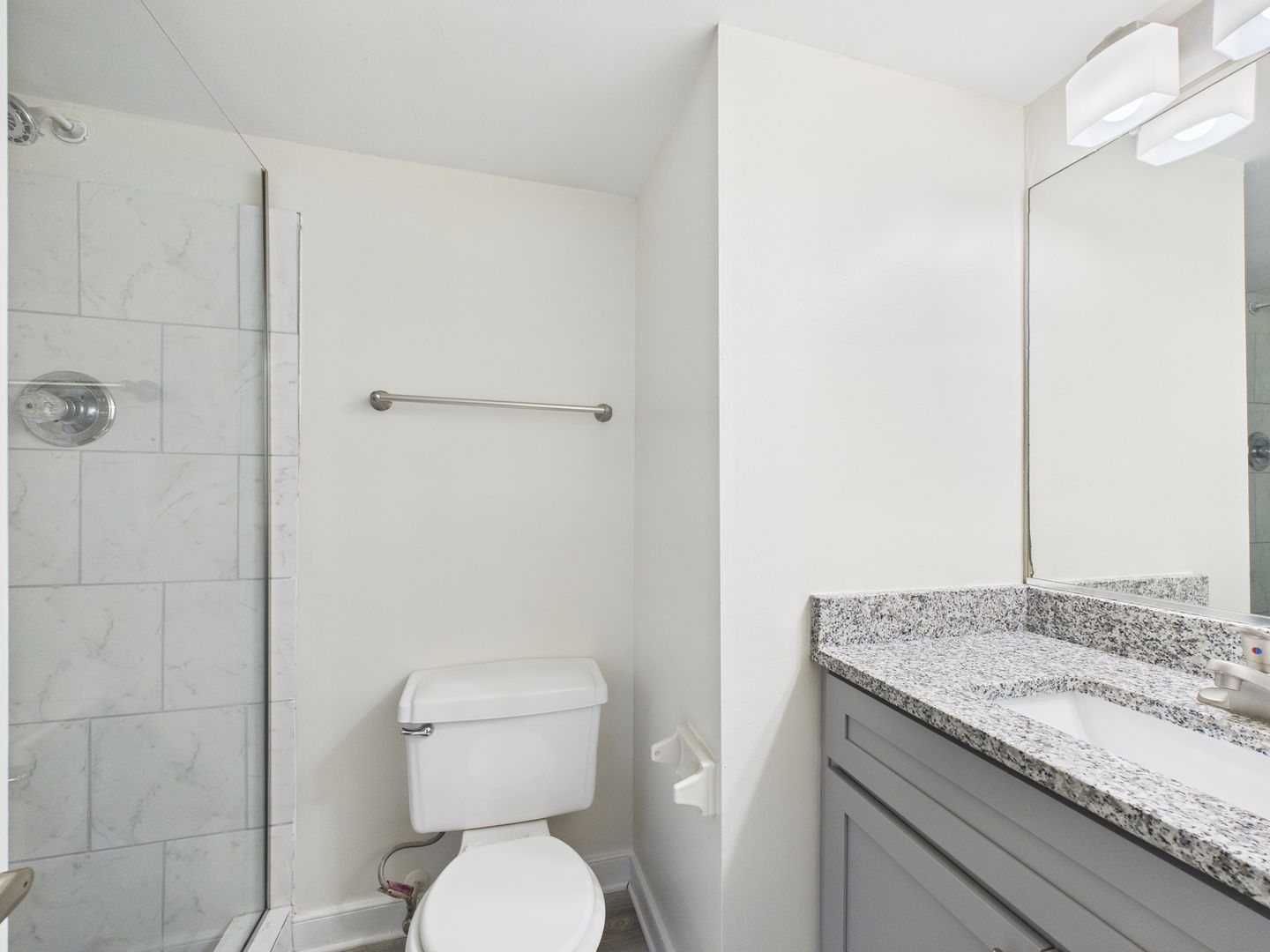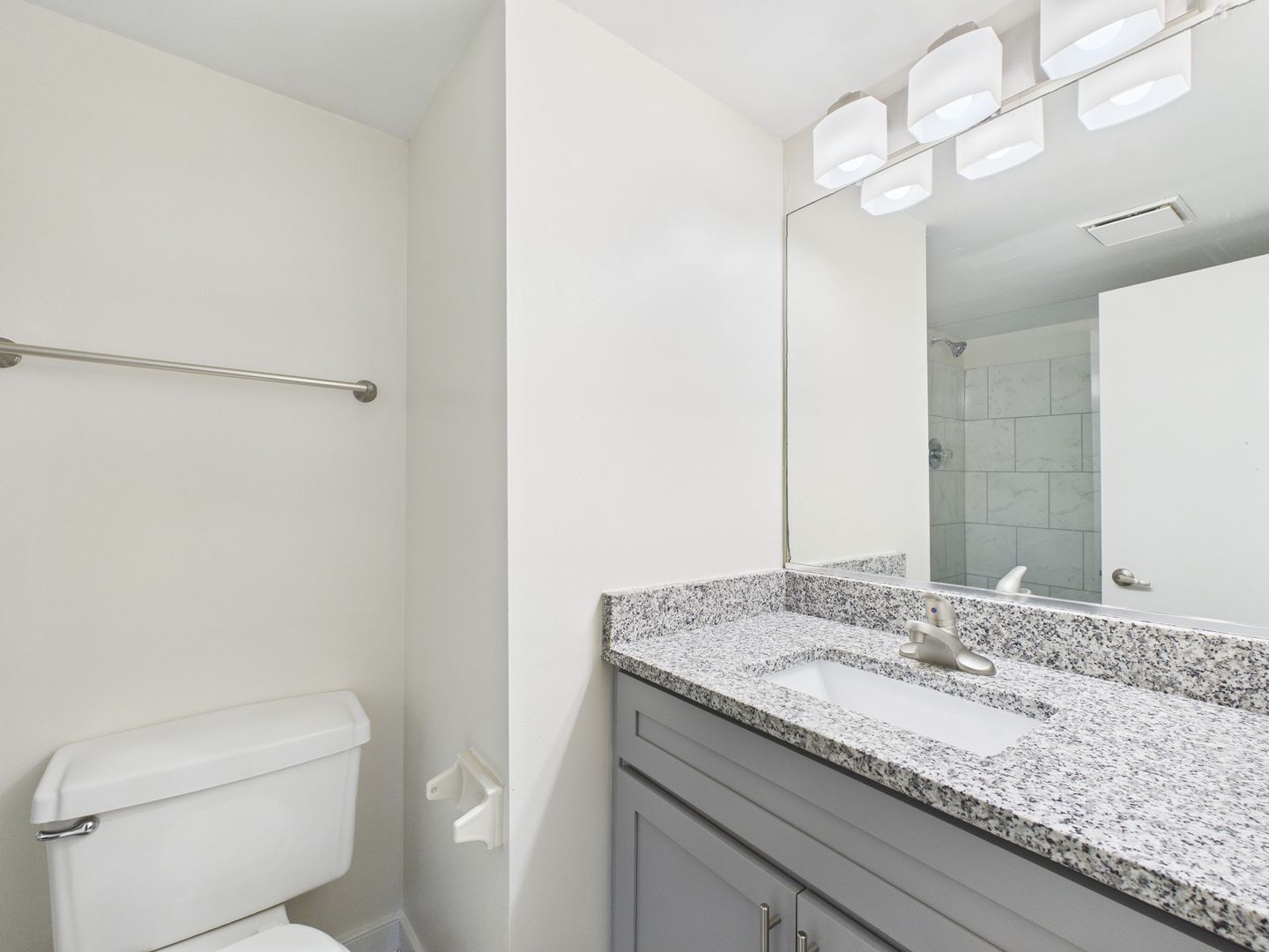 The bathroom offers a contemporary touch with a granite countertop vanity, brushed nickel fixtures, and ample cabinet storage. A large mirror and modern vanity lighting enhance the clean, bright aesthetic.